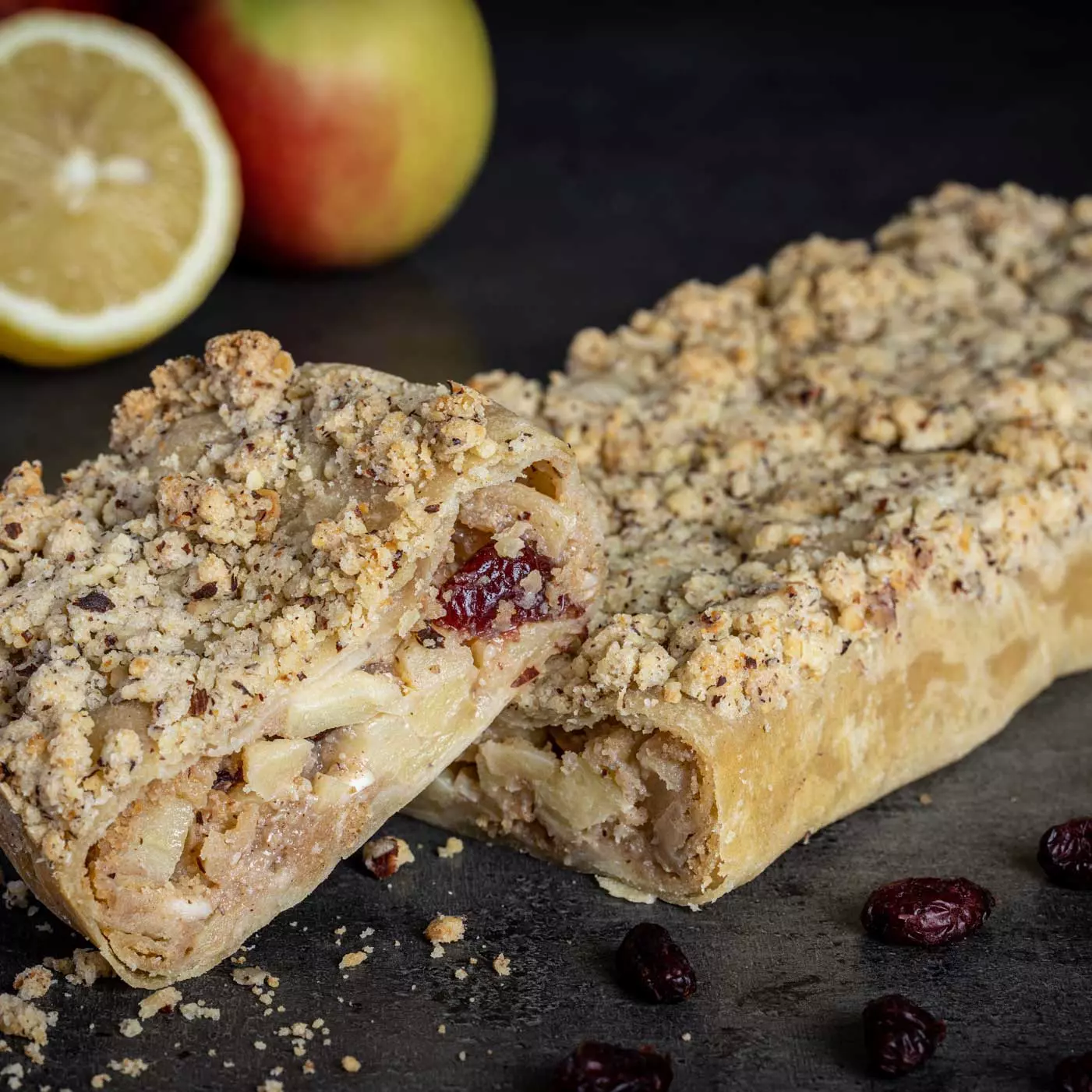 Knackig frische Äpfel werden fein geschnitten, und mit aromatischen Cranberries und einem Hauch Zimt auf feinen Bröseln aufgelegt, und von Hand aufgerollt. Wem da nicht das Wasser im Mund zusammenfließt…