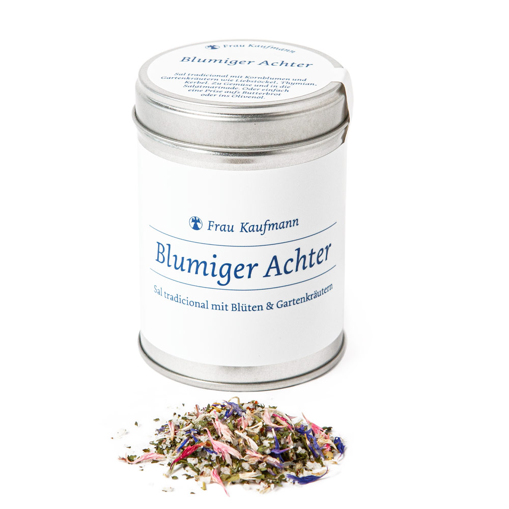 Der Blumige Achter ist eine Gewürzmischung aus Fleur tradicional mit Kornblumen, Blütenpollen und Gartenkräutern wie Liebstöckel, Thymian und Kerbel. Hergestellt in der Frau Kaufmann Gewürzwerkstatt im Bregenzerwald. Ein Allroundtalent, passt zu fast allem. Ins Gemüse und in die Salatmarinade.