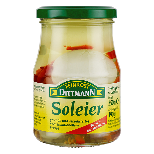Feinkost Dittmann bietet nun auch Soleier an: gekochte und geschälte Eier in einer salzig-sauren Lake. Servieren Sie die ursprünglich aus der Berliner Küche stammende Spezialität mit Essig und Öl sowie etwas Senf. Traditionell werden die Eier vor dem Verzehr längs halbiert und das Eigelb wird herausgenommen. Daraufhin würzt man das Ei nach Belieben mit Essig, Öl, Salz und Pfeffer, setzt das Eigelb wieder ein und gibt etwas Senf dazu.