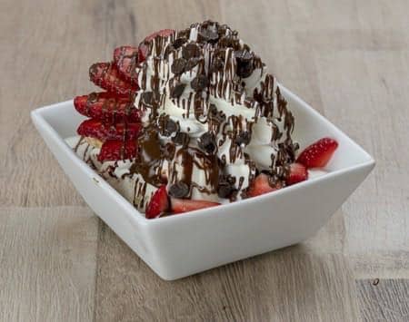 Frische Erdbeeren, Nutella, Schokoladenraspel, Joghurt, 3 Kugeln Joghurteis, Schlagsahne NUHG
