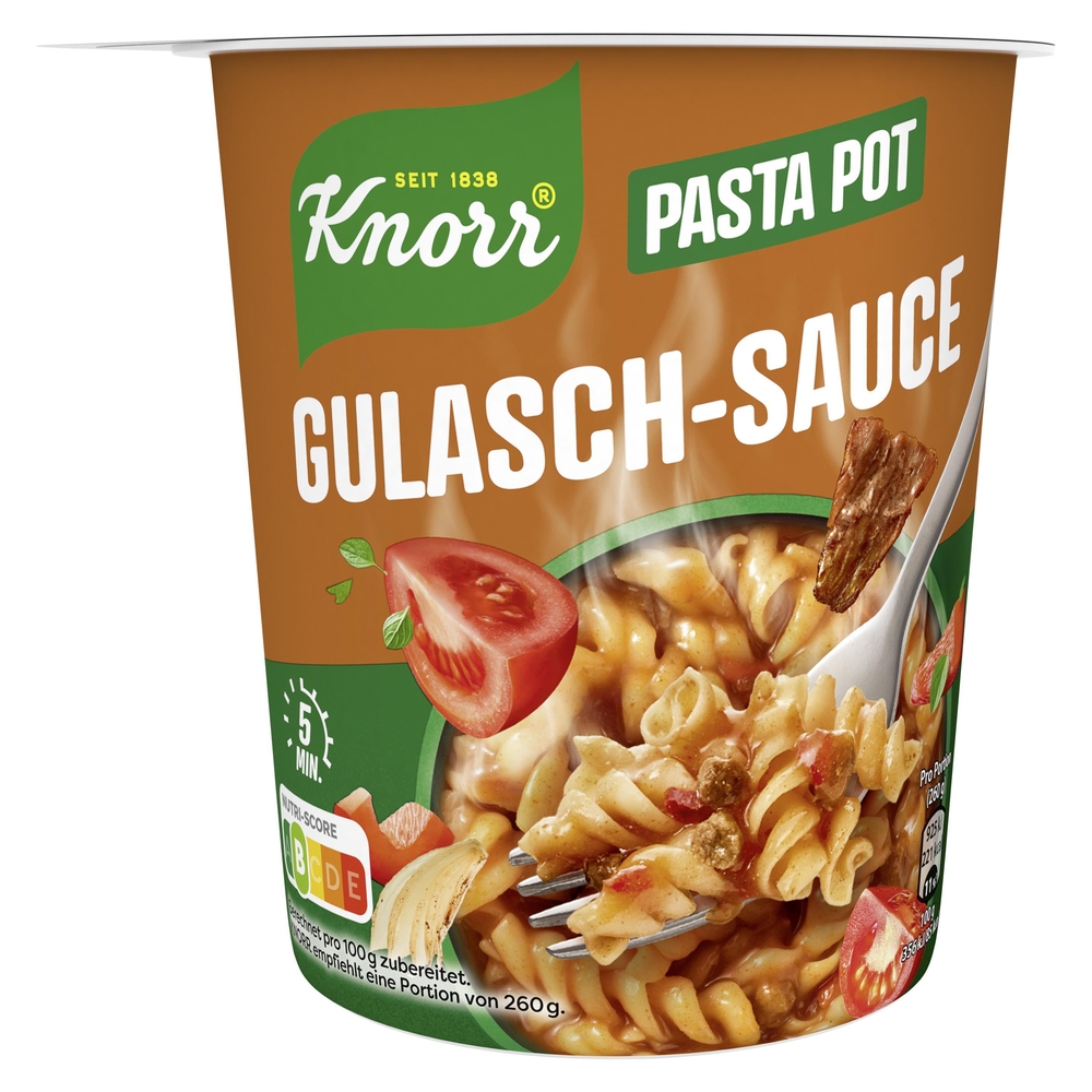 Knorr Pasta Snack Pot Gulasch-Sauce — leckere Instant Nudeln als kleine warme Mahlzeit. Der Knorr Pasta Snack Gulasch-Sauce ist der ideale Snack im Büro oder wenn zu Hause mal keine Zeit zum Kochen ist. Dabei ist er mit heißem Wasser aufgegossen ruckzuck zubereitet. Auch die Wartezeit von 5 Minuten ist nicht zu lange, bis man die kleine Zwischenmahlzeit genießen kann.
