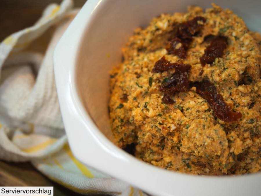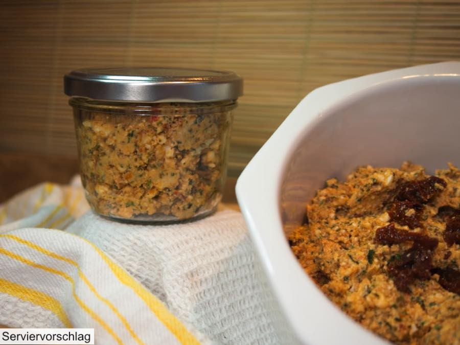 Erzeugnis aus 70% FETAKÄSE (SCHAFMILCH), 10% Speiseöl, 15% Tomaten, 5% Kräuter/Knoblauch
