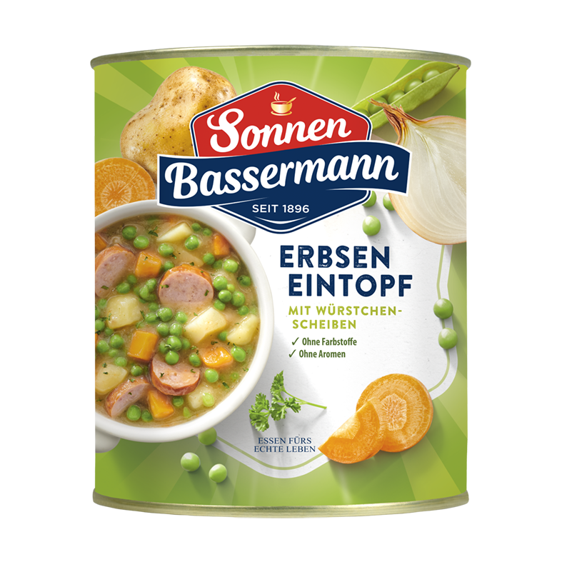 Unser Sonnen Bassermann Erbsen-Eintopf mit herzhaften Würstchen. Knackige Erbsen, verfeinert mit aromatischen Gewürzen und dazu noch deftige Bockwürstchen – wer könnte da widerstehen? Ein Eintopf, der dich wärmt und satt macht!