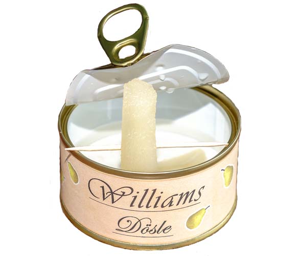 Unser Williams Dösle, ein ausgezeichneter Williams Birnenbrand mit zwei Birnenstücken in der Dose. Kunststoffdeckel entfernen, Zahnstocher auspacken, Dose aufreißen, Birnen genießen und austrinken