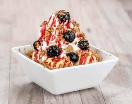 Amarenasauce, Amarenakirschen, zerbröseltes Zimtgebäck, gemahlener Zimt, 3 Kugeln Eis (Vanille, Stracciatella, Schokolade), Schlagsahne NCFVE